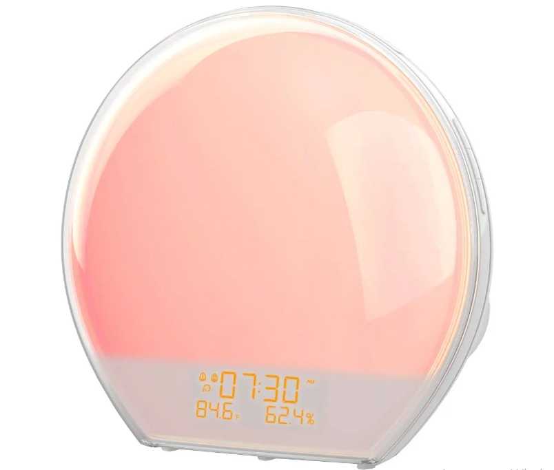 Это бюджетный световой будильник с приятным дизайном. Розовый корпус невольно ассоциируется с карамелькой, поэтому подойдет любителям всего «мимимишного». Подойдет для дома, ремонт которого выполнен с пастельных тонах. Есть несколько вариантов мелодий – от звуков дикой природы до игры музыкальных инструментов. Для любителей FM-радио есть плюс — можно сохранять любимые радиостанции.