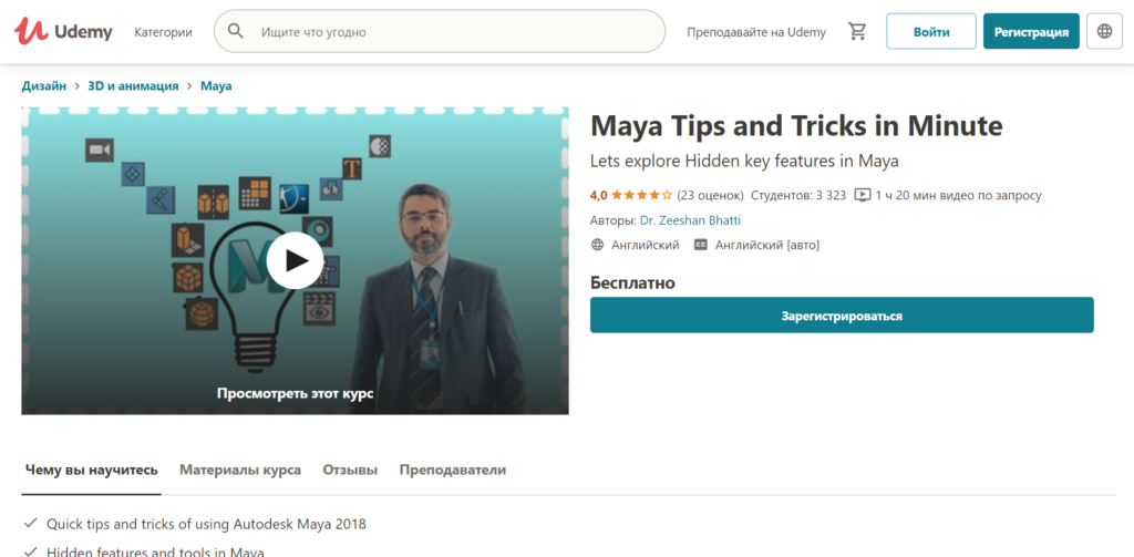 В курсе есть советы, содержащие множество скрытых функций Maya. Материал доступен только на английском, это — большой недостаток. Также нельзя пообщаться с преподавателем, если что-то оказалось непонятно. А вот к плюсам можно отнести то, что далеко не каждый русскоязычный источник обладает знанием подобных фишек