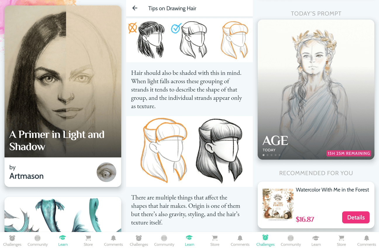 Но ежедневной практикой всё не ограничивается. В Sketch a Day можно учиться, для этого есть специальный образовательный раздел. Можете прокачивать новые техники, получать советы, перенимать опыт других художников. Статьи в разделе попадаются разные, от «Введения в теорию цвета» до вполне подробной вроде «Терминологии референсов в изобразительном искусстве».
