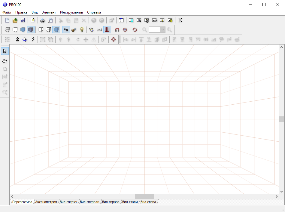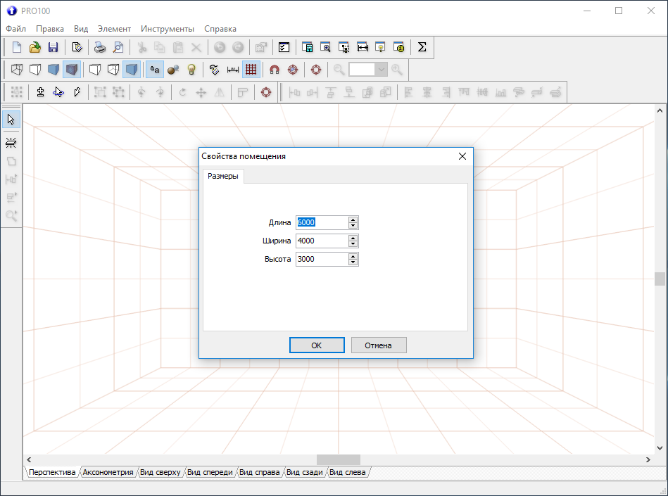 В числовых полях Длина, Ширина и Высота с помощью кнопок счетчика введите размеры помещения, в котором будет расставляться мебель, и нажмите кнопку OK — окно закроется и откроется окно редактора (рис. 4).