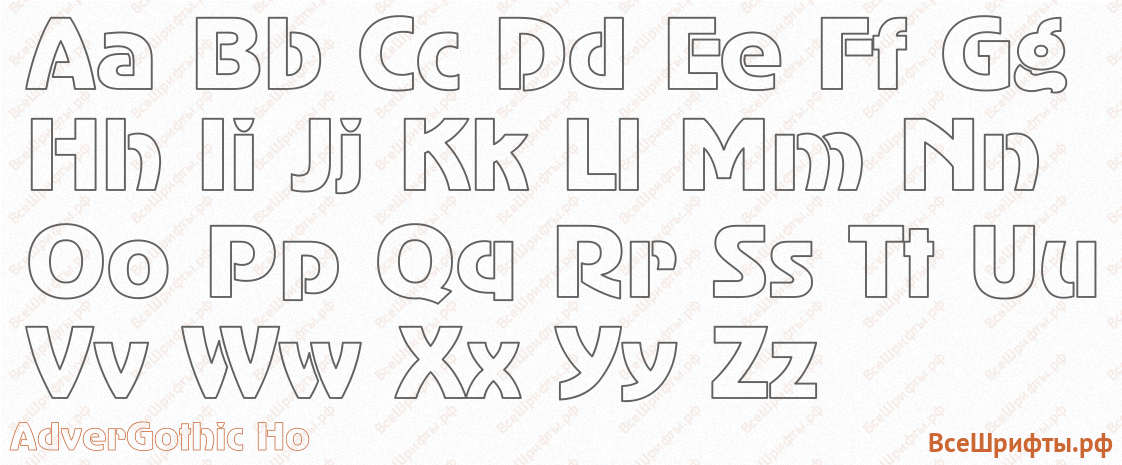 Предварительный просмотр шрифта «AdverGothic Ho» с прописными и строчными латинскими буквами (английский алфавит A-Z и a-z).