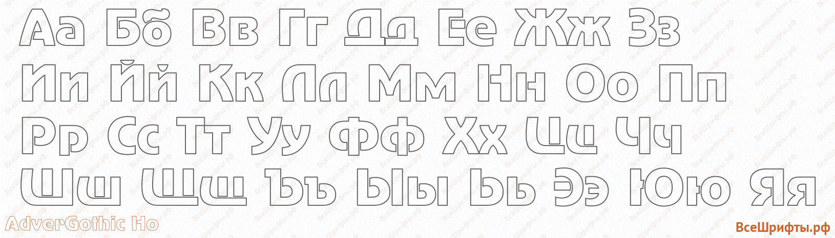 Предварительный просмотр шрифта «AdverGothic Ho» с прописными и строчными русскими буквами (кириллица, русский алфавит А-Я и а-я).