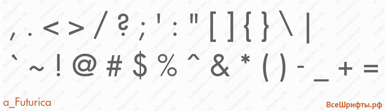 Предварительный просмотр шрифта «a_Futurica» со знаками препинания и пунктуации (, . / ? ; ‘ : » { } \ | ` ~ ! @ # $ % ^ & * ( ) — _ + =).