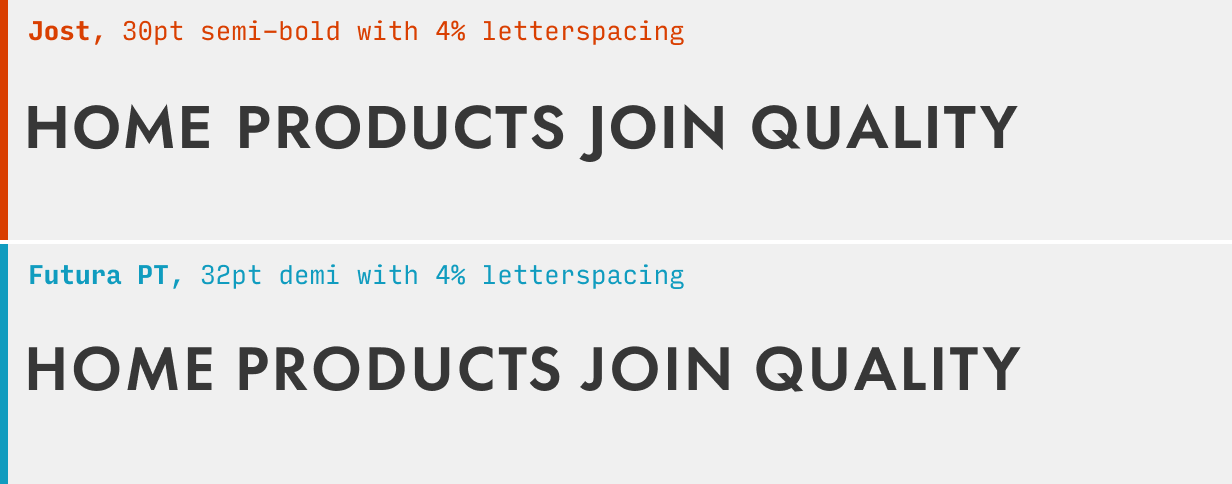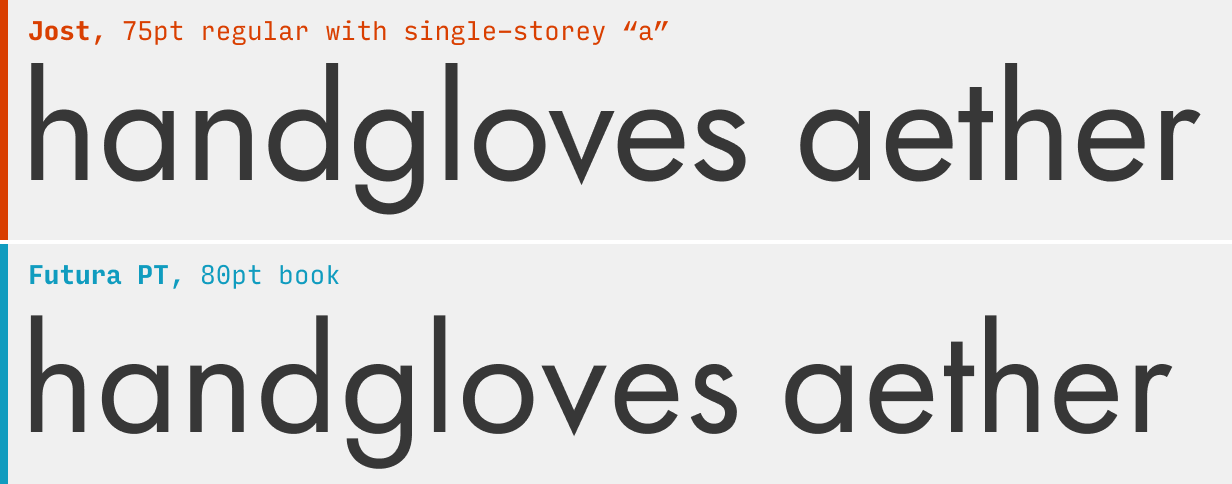Since Futura is so often used in uppercase (and for good reason – it looks very crisp and punchy!), it’s worth doing a comparison in that setting. In my opinion, Jost has some slightly more awkward uppercase forms – the “M” and “N”, and “J” with descender, for instance. But it’s nothing that would keep me from using this as a free, cross-platform Futura alternative.