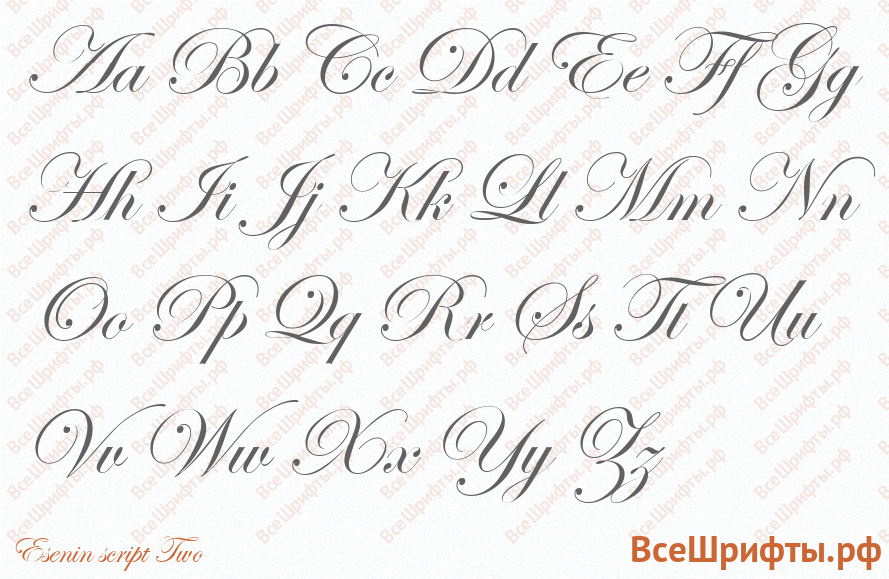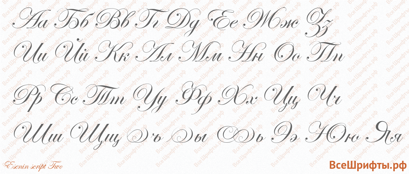 Предварительный просмотр шрифта «Esenin script Two» с прописными и строчными русскими буквами (кириллица, русский алфавит А-Я и а-я).