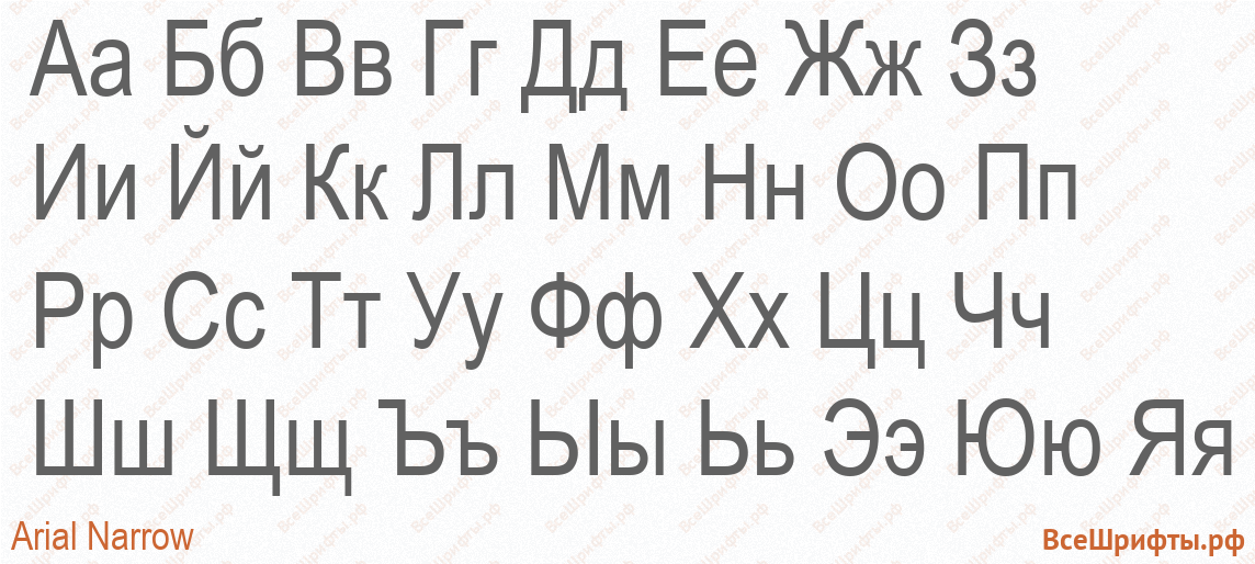 Предварительный просмотр шрифта «Arial Narrow» с прописными и строчными русскими буквами (кириллица, русский алфавит А-Я и а-я).