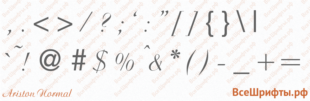 Предварительный просмотр шрифта «Ariston Normal» со знаками препинания и пунктуации (, . / ? ; ‘ : » { } \ | ` ~ ! @ # $ % ^ & * ( ) — _ + =).