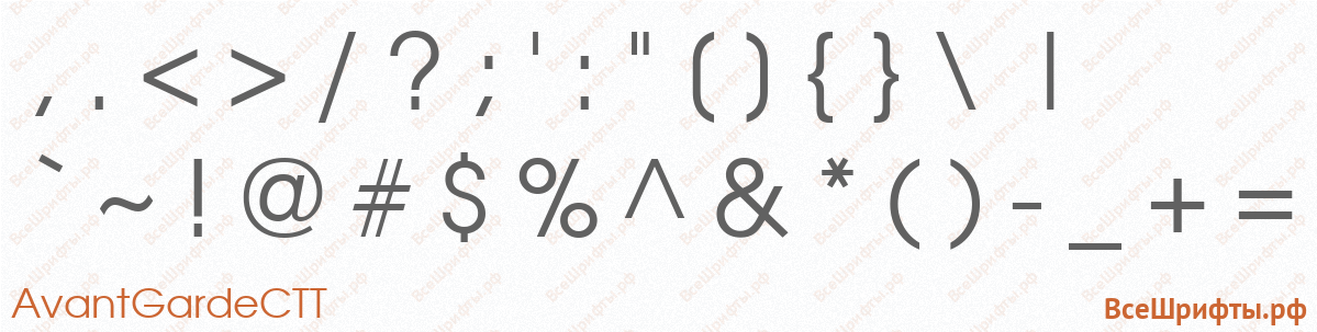 Предварительный просмотр шрифта «AvantGardeCTT» со знаками препинания и пунктуации (, . / ? ; ‘ : » { } \ | ` ~ ! @ # $ % ^ & * ( ) — _ + =).