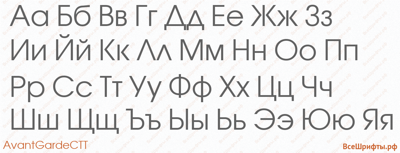 Предварительный просмотр шрифта «AvantGardeCTT» с прописными и строчными русскими буквами (кириллица, русский алфавит А-Я и а-я).