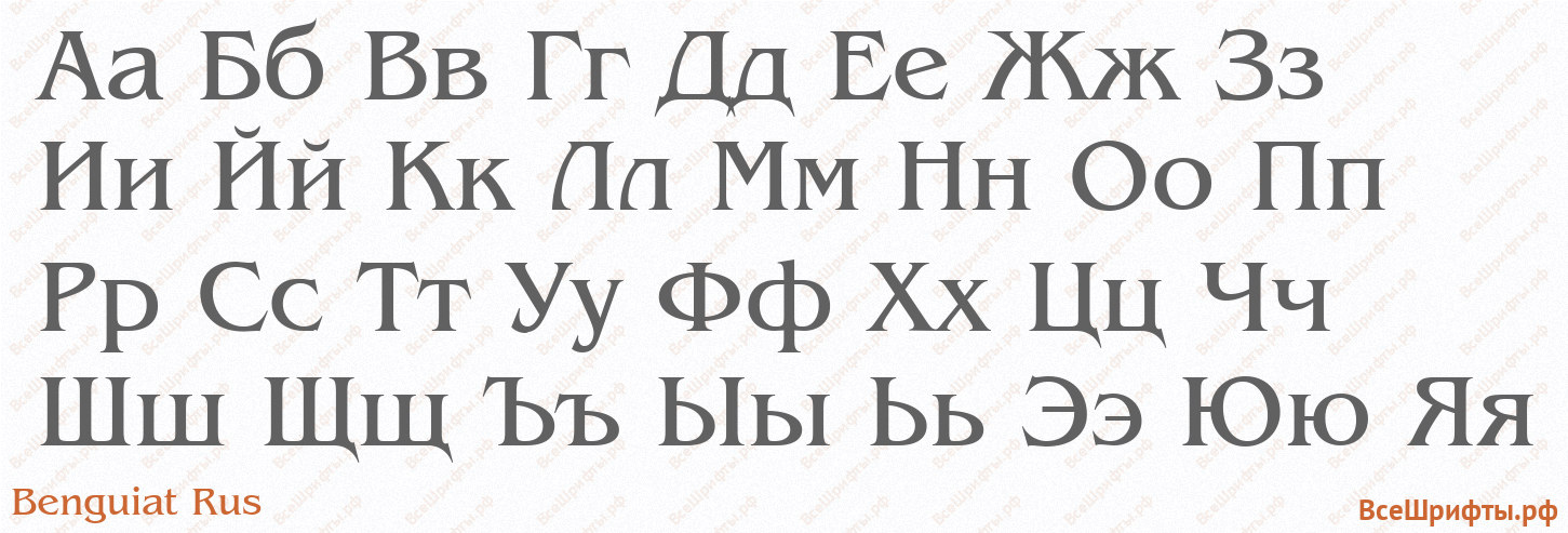 Предварительный просмотр шрифта «Benguiat Rus» с прописными и строчными русскими буквами (кириллица, русский алфавит А-Я и а-я).