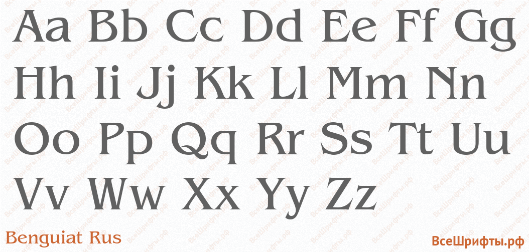 Предварительный просмотр шрифта «Benguiat Rus» с прописными и строчными латинскими буквами (английский алфавит A-Z и a-z).