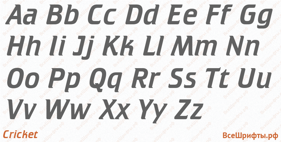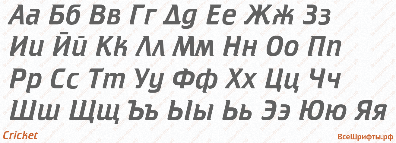 Предварительный просмотр шрифта «Cricket» с прописными и строчными русскими буквами (кириллица, русский алфавит А-Я и а-я).