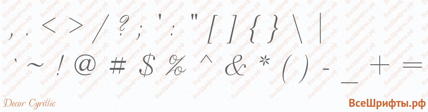 Предварительный просмотр шрифта «Decor Cyrillic» со знаками препинания и пунктуации (, . / ? ; ‘ : » { } \ | ` ~ ! @ # $ % ^ & * ( ) — _ + =).