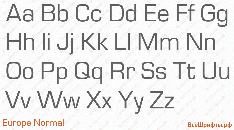 Предварительный просмотр шрифта «Europe Normal» с прописными и строчными латинскими буквами (английский алфавит A-Z и a-z).