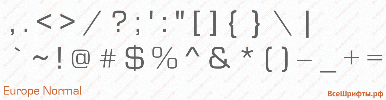Предварительный просмотр шрифта «Europe Normal» со знаками препинания и пунктуации (, . / ? ; ‘ : » { } \ | ` ~ ! @ # $ % ^ & * ( ) — _ + =).