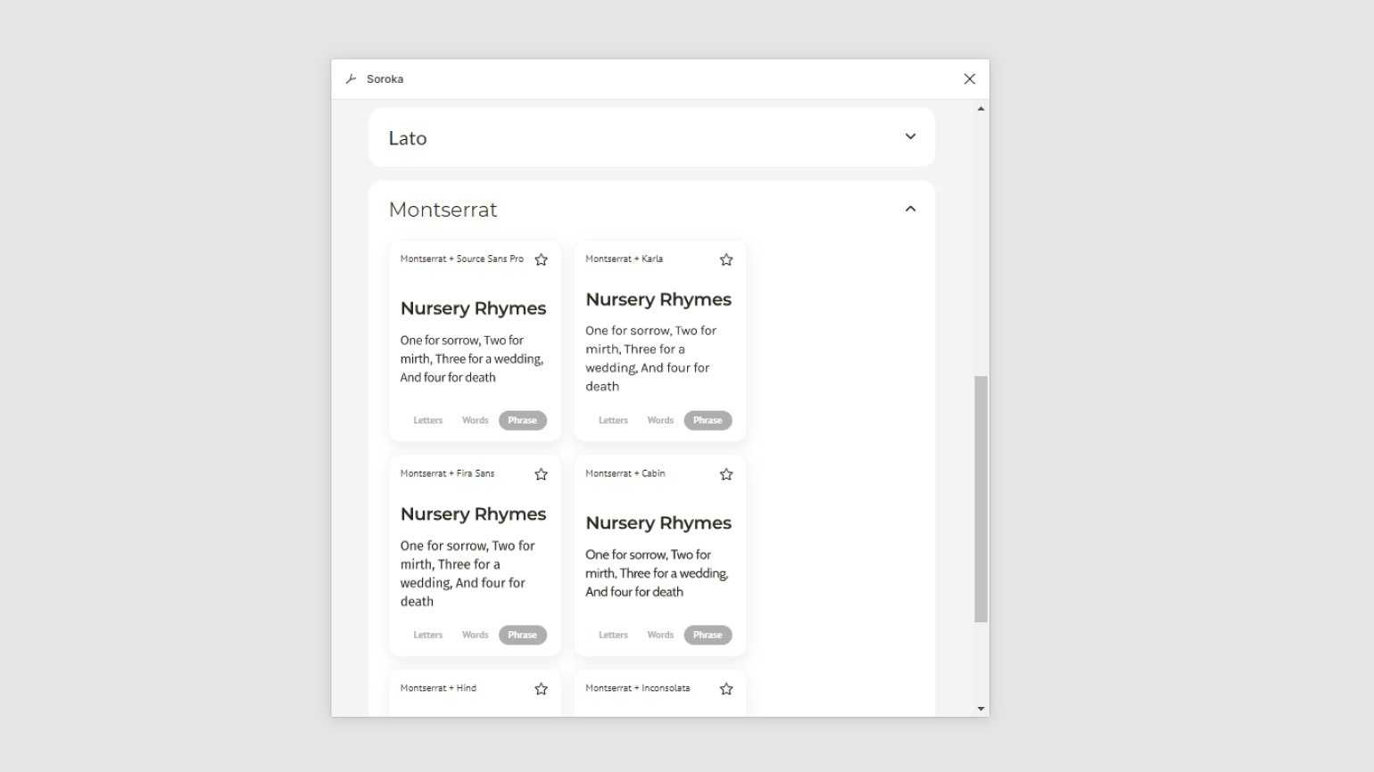 Чтобы не тратить время на подбор шрифтовых пар вручную, воспользуйтесь плагином Soroka. У него есть большая база из сочетаний бесплатных шрифтов Google Fonts, которые можно использовать в вашем макете: