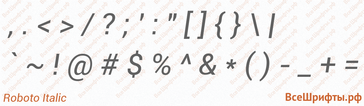 Предварительный просмотр шрифта «Roboto Italic» со знаками препинания и пунктуации (, . / ? ; ‘ : » { } \ | ` ~ ! @ # $ % ^ & * ( ) — _ + =).