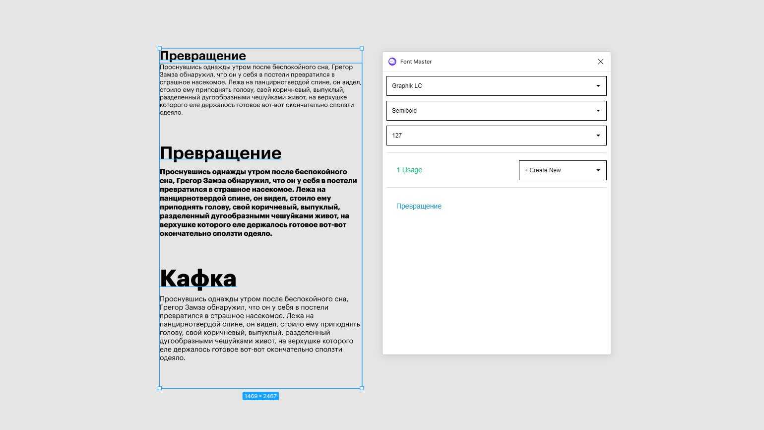 В Figma очень удобно следить за используемыми цветами — достаточно выделить все объекты на макете и посмотреть на панель справа. Но кегль, интерлиньяж, кернинг и шрифты таким образом не отображаются. Плагин Font Master решает эту проблему — он показывает все используемые настройки текста на макете и при необходимости создаёт из них полноценный стиль.