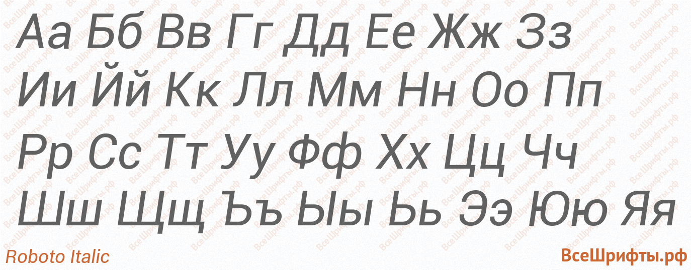 Предварительный просмотр шрифта «Roboto Italic» с прописными и строчными русскими буквами (кириллица, русский алфавит А-Я и а-я).