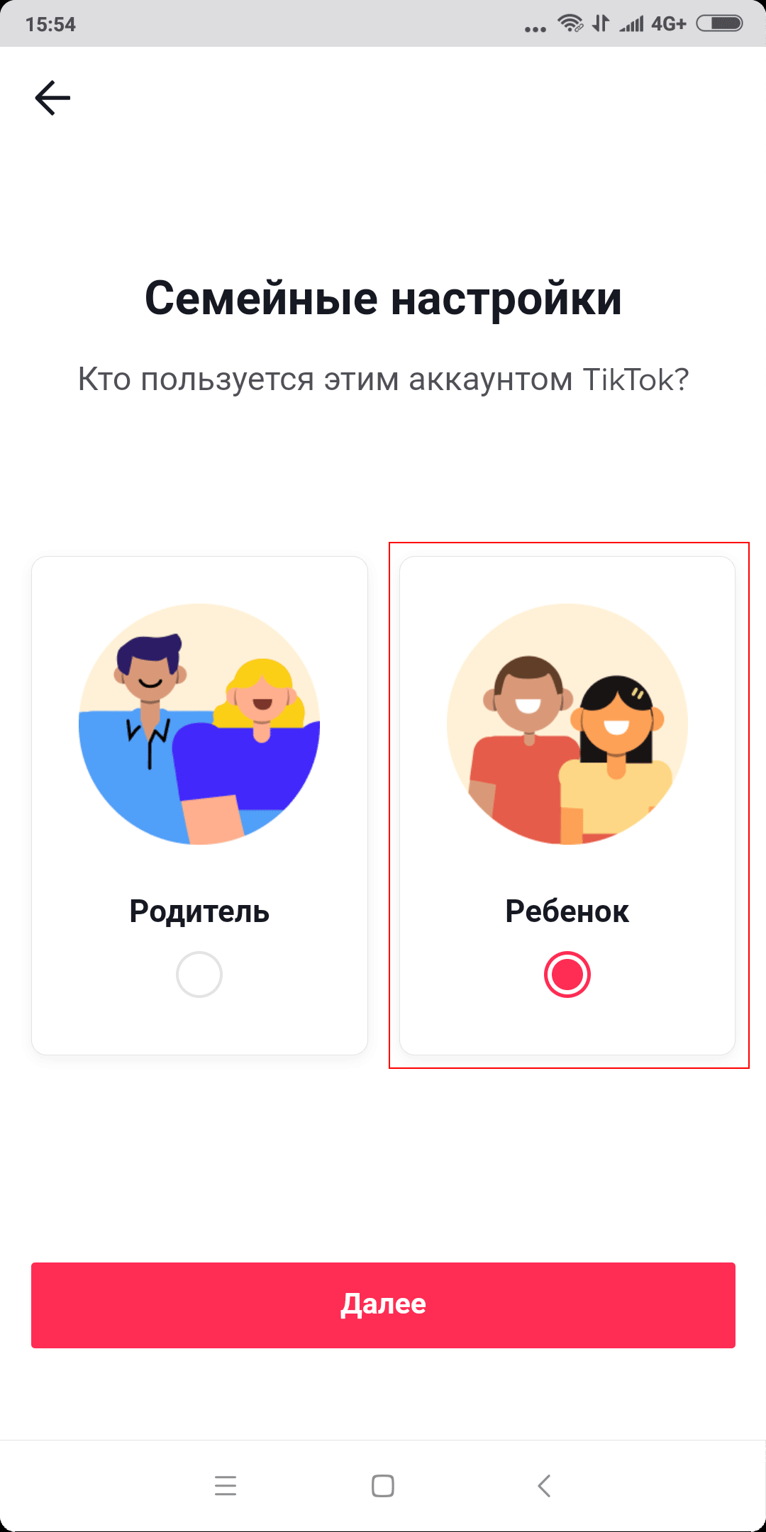 10. Выберите «Ребенок» и кликните «Далее».