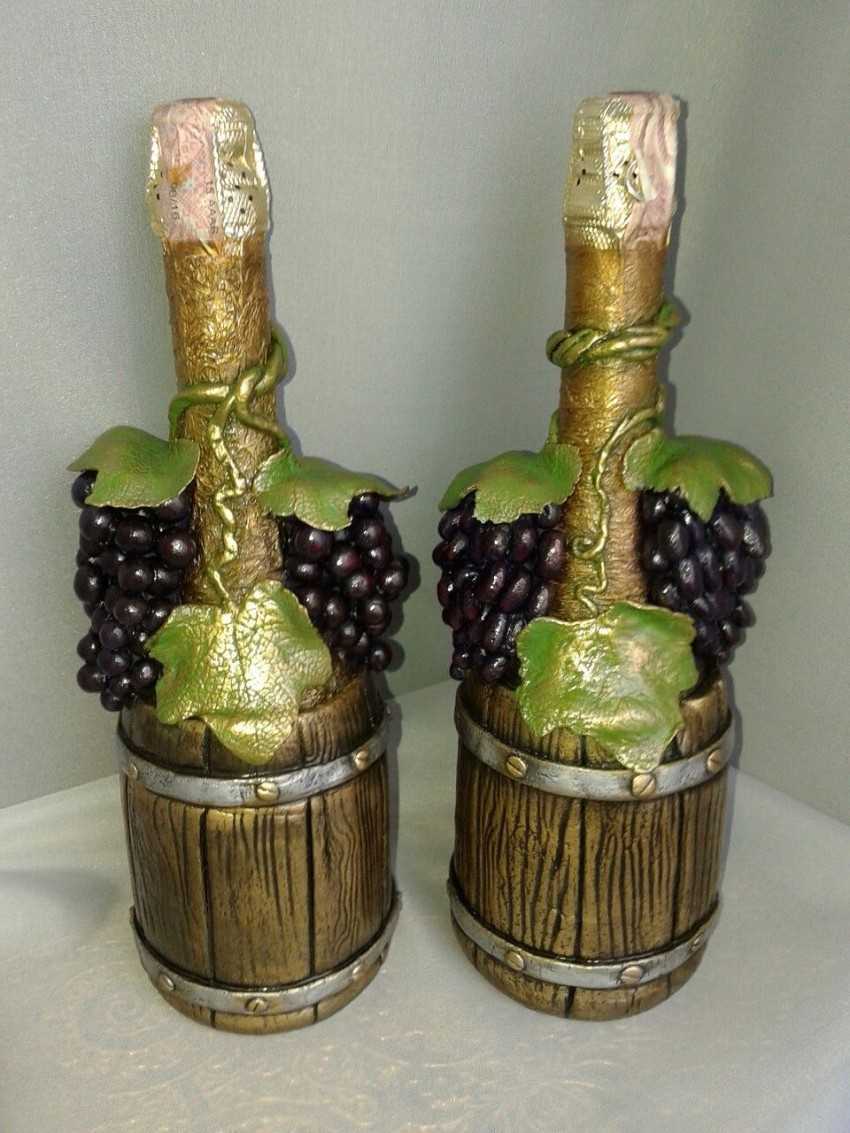 После полного высыхания декоративную бутылку покрывают лаком. С использованием данной техники реально создать украшения для любого интерьера.