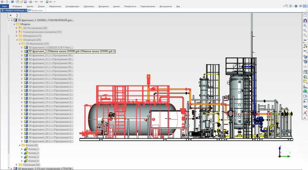 Сборочная модель данного проекта состоит из более чем 18000 тел, при этом все модели максимально детализированы, в том числе и приборы КИПиА. Еще одной особенностью проекта является широкое применение средств параметризации T-FLEX CAD, благодаря которым автору проекта удалось выполнить его в кратчайшие сроки.