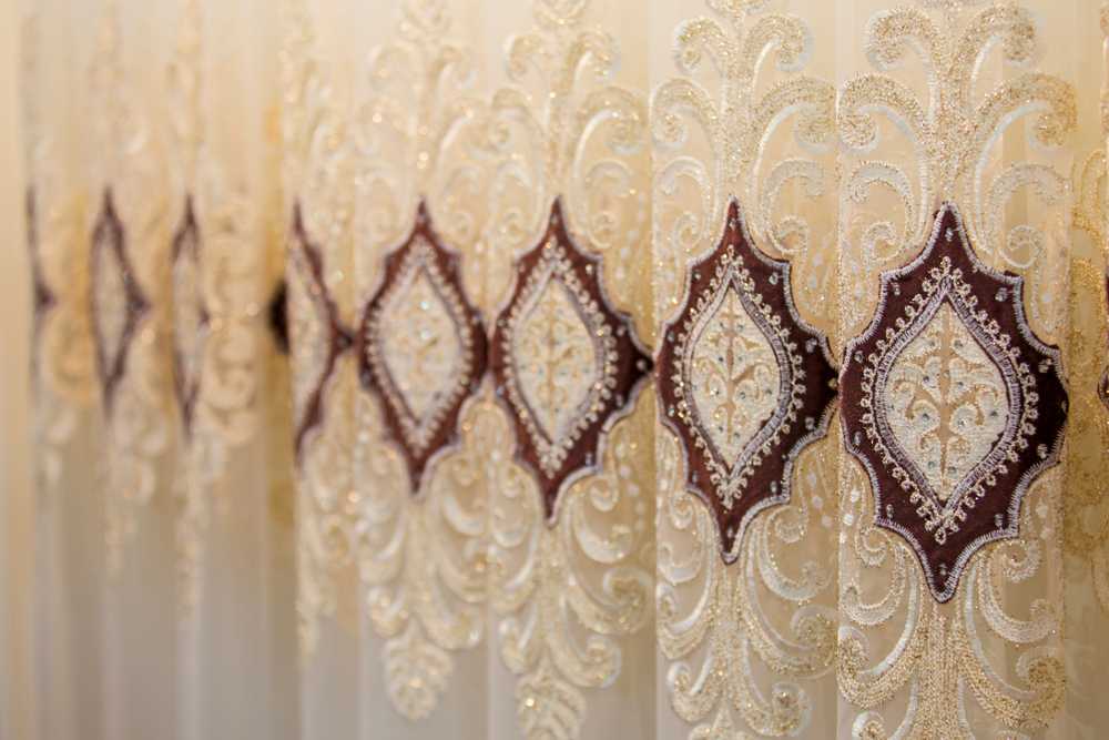 - тюль с вышивкой, люрексом, пайетками, кисточками, рюшем, бахромой и другими видами декора.