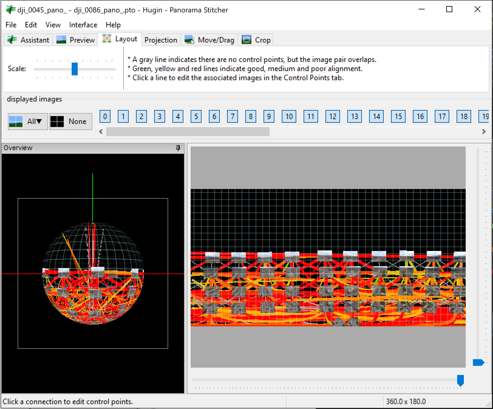 Как только вы окажетесь в интерфейсе «Assistant», достаточно просто кликнуть по Step 2, «Align…». Hugin запустит фоновую задачу, посредством которой попытается выровнять и сшить изображения, используя контрольные точки, которые определяются в их перекрытии. Если все пойдёт хорошо, вам останется исправить горизонт, перетащив его вверх и вниз в режиме просмотра «Layout». Hugin также покажет вам все связи, которые он установил между изображениями. Если вы видите серые линии, значит, с некоторыми из них соединиться не удалось. Вы сможете исправить это, кликнув по связи и определив соответствующие точки между изображениями, которые Hugin может использовать.
