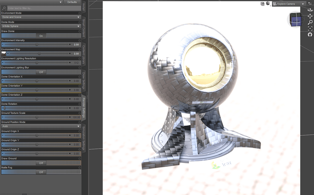 After that, there are “Dome Orientation” and “Rotation” options. So you can change the position of the HDR image compared to your scene. For example, if in your case some tree or building from the picture covers the object, thus hiding it from the lighting source. So you can change that without any problem. I used this function to place Daz Studio HDRI in the way, so the building is right in the center of a reflective surface:
