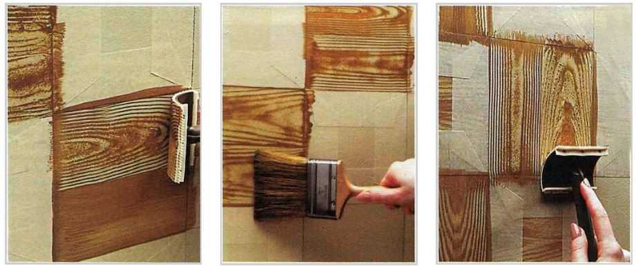 Чтобы создать покрытие, имитирующее текстуру дерева, нужно глазурь более густой краски нанести на первый слой слабоглянцевой латексной эмалевой краски. Рокером протянуть по влажной глазури, двигая рокер вперед и назад. Таким образом вы получите удлиненные овальные следы, имитирующие узоры древесины.