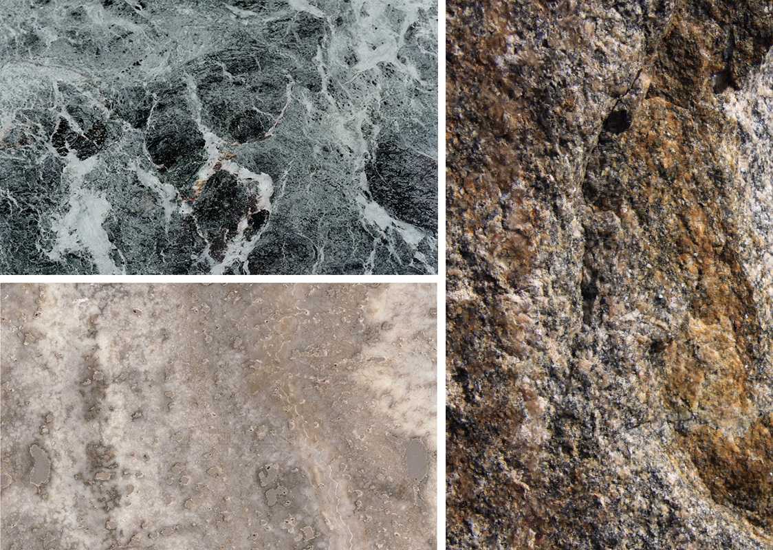Виды фактур: полированная (мрамор), шлифованная (травертин), необработанная (гранит)