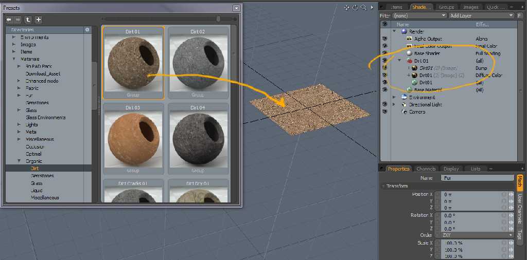 Каждый слой Fur Material затеняется настройкам слоя Material, но иногда бывают моменты, когда необходимо чтобы Fur Material отличался от поверхности на котором он расположен. Как пример можно взять траву и землю на которой она растет. Данное действие можно без проблем осуществить. Для этого создаем плоскость и присваиваем материал Dirt из пресетов материалов. В Shader Tree появилась группа материала Dirt, которая имеет слой Diffuse Color и Bump.