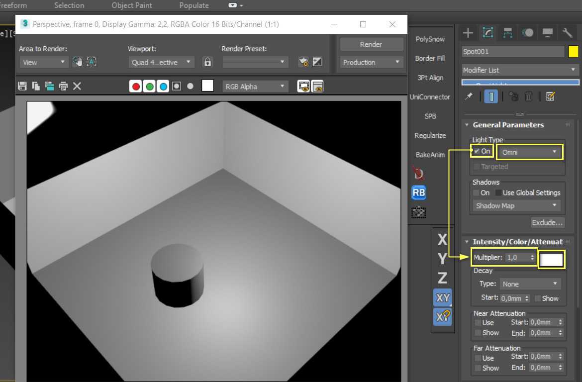 Omni – это круговой рассеянный источник света. В свитке General Parameters прежде всего нужно включить Light Type On (включает свет). Если рендер остается темным, рекомендую сильно увеличить значение Multiplier в разделе Intensity/Color/Attenuation. Цветной прямоугольник рядом позволяет выбрать цвет свечения.