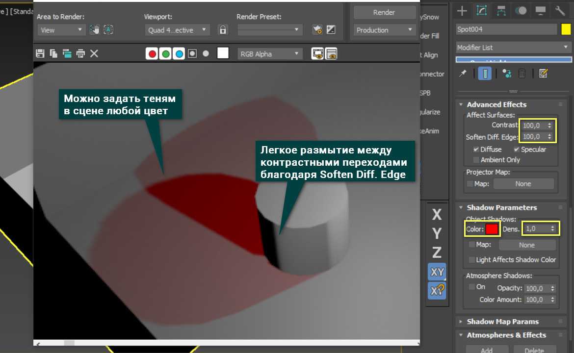 В разделе Advanced Effects функция Contrast усиливает контраст теней. Soften Diff. Edge смягчает края при пересечении нескольких источников света. Раздел Shadow Parameters позволяет регулировать настройки теней. Color определяет цвет тени. Но при низких значениях Dens цвет может не меняться. Dens отвечает за интенсивность тени.