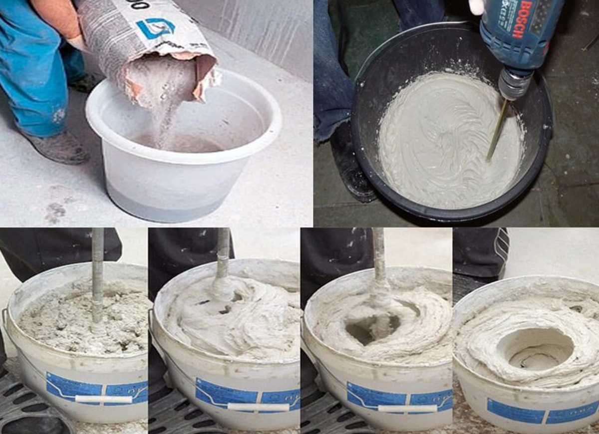 Готовые растворы перемешиваются в ведре за 5 минут. Это нужно, чтобы осевший на дно камень равномерно распределился по субстанции.