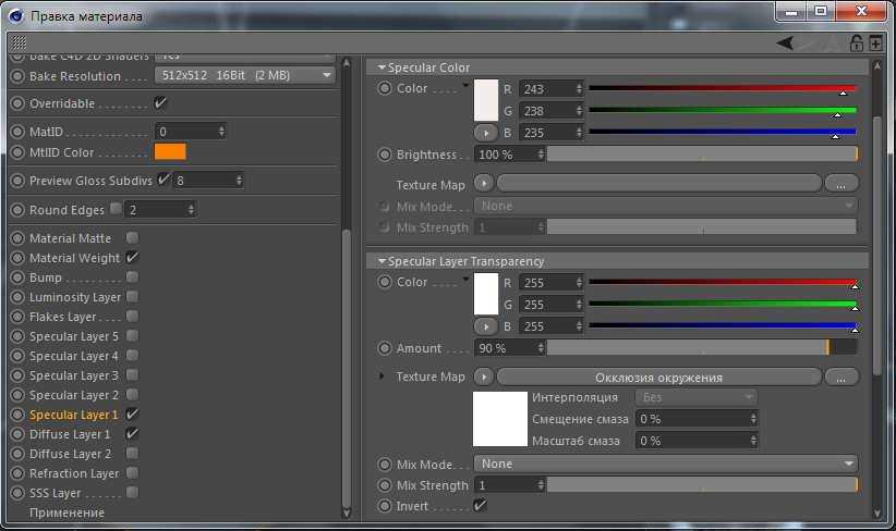 Мы установили базовый уровень, теперь должны создать отражение. Чтобы получить это, используем Ambient Occlusion в качестве карты отражения. Активируем слой Specular Layer 1, цвет в Specular Layer Color оставляем белый, в слой Specular Layer Transparency добавляем эффект Occlusione Ambientale, ставим галочку Invert.