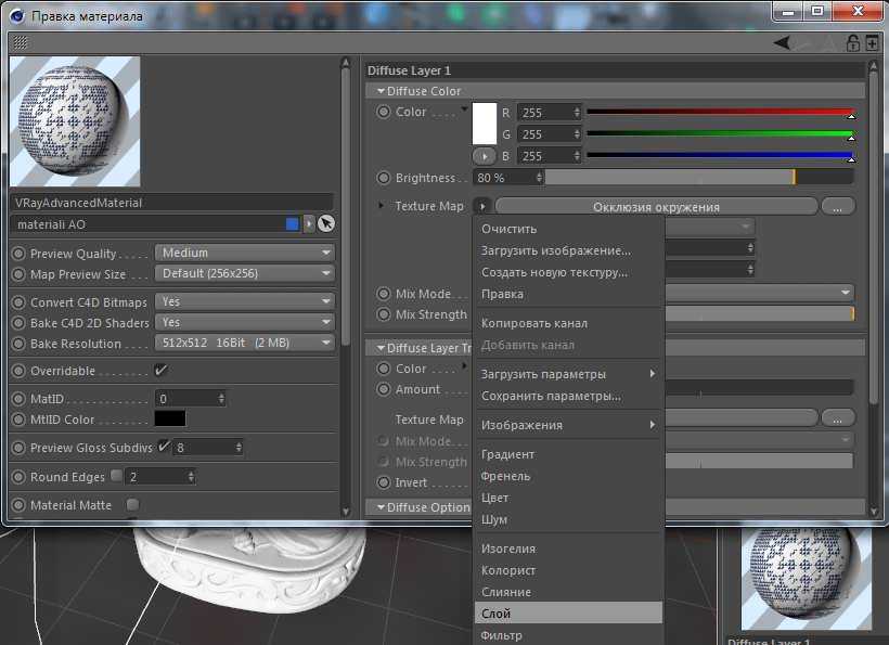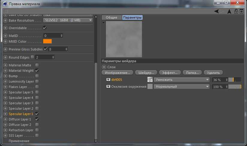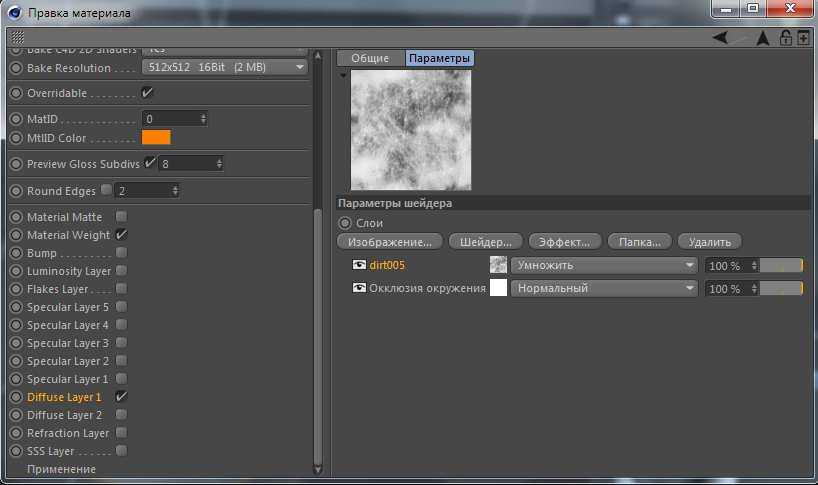 Шейдер слой – это шейдер через который мы можем сложить больше текстур в одном канале. При нажатии на панели предварительного просмотра, можно получить доступ к параметрам слоя и добавить текстуру грязи (нажав кнопку «Image …» кнопка открывает браузер), перекрывая AO, оставляем Multiple режим.