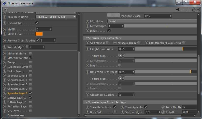 Таким образом, слой Diffuse Layer 1 и слой Specular Layer будут работать в идеальном режиме. Изменяем параметры отражения и светового блика: Reflection Glossiness до значения 0.75, а Hilight glossiness до 0.65.