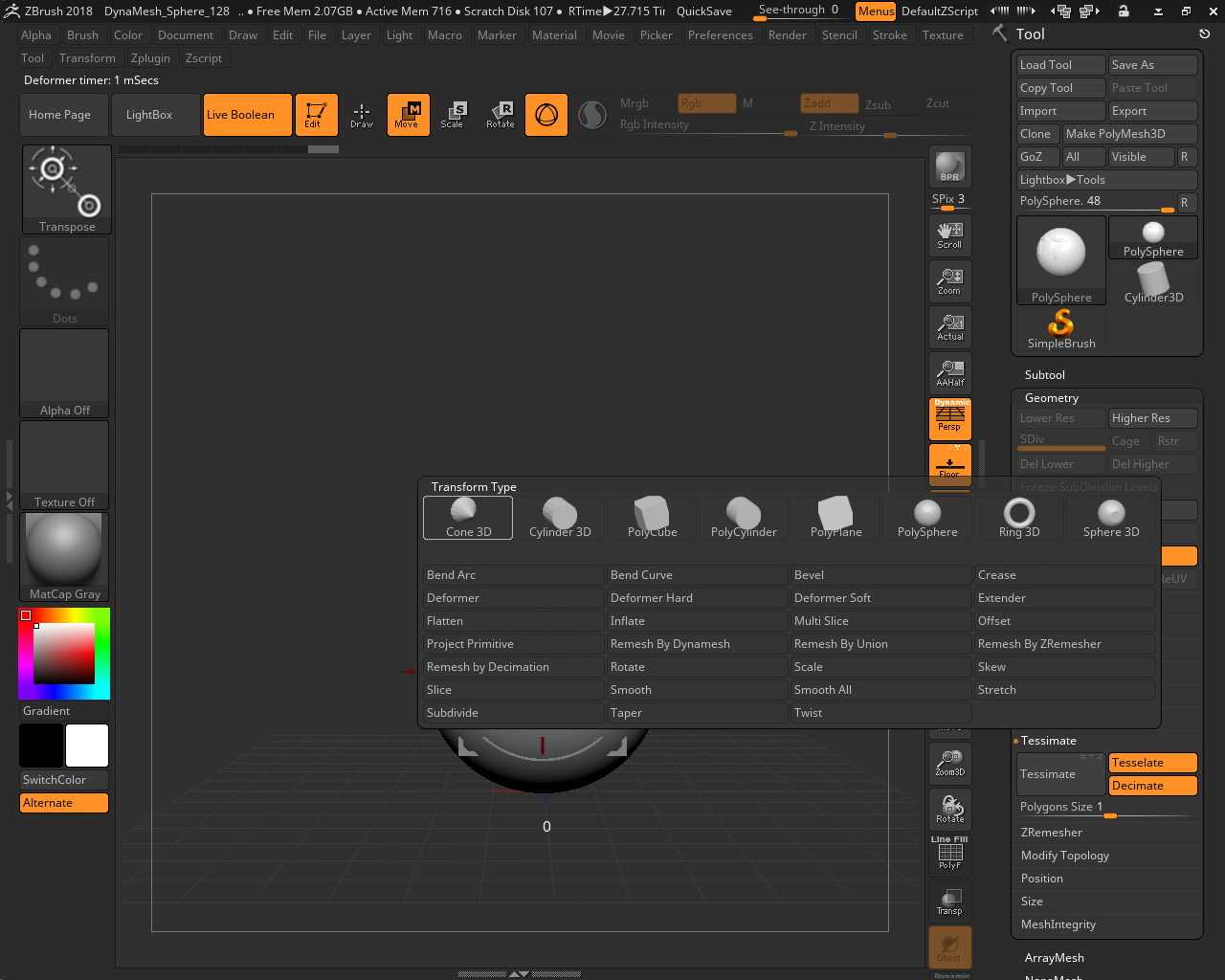 Трехмерные модели в Zbrush состоят из множества точек, каждая из которых несет информацию о своем положении, материале и цвете. При помощи специальных, умных кистей, вы можете влиять на эти точки (перемещать, вдавливать, выпячивать, разукрашивать).