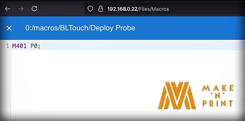 Within the newly created macro, insert the G-Code commands required. In the case of a BLTouch, the deploy probe command would be M401 P0. Furthermore, I like to leave a little note at the end of each row of G-Code to remind me what it does. But remember to insert a semicolon after the command to prevent it from reading as a G-Code command.