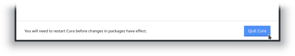 After installation you will be notified on the bottom of the window to quit Cura and restart it. Just do so to complete the installation!