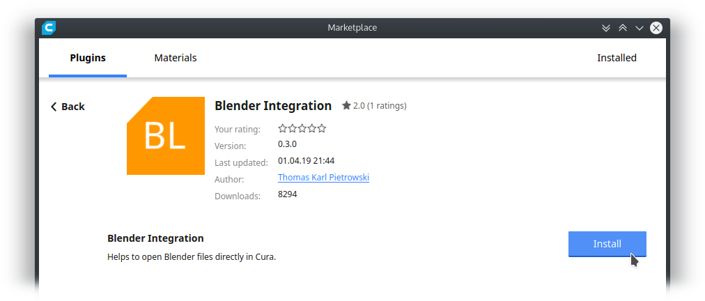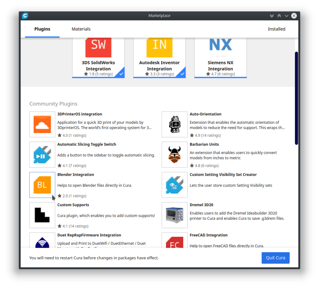 Ultimaker Cura’s marketplace: Installed SolidWorks plugin