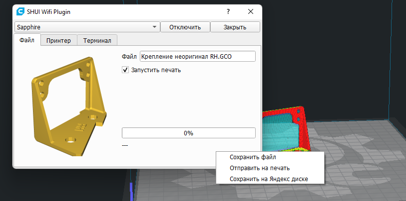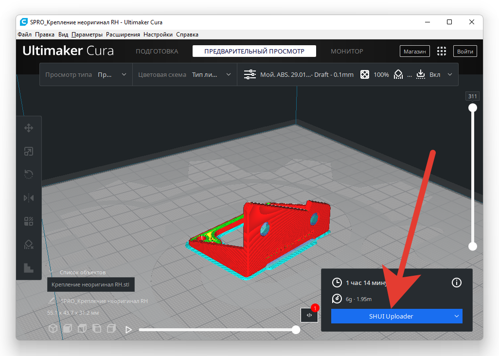 Итак, если всё правильно настроено, и при загрузке Cura нет сообщений об ошибке, тогда достаем модель, нарезаем её в слайсере и пробуем использовать плагин: