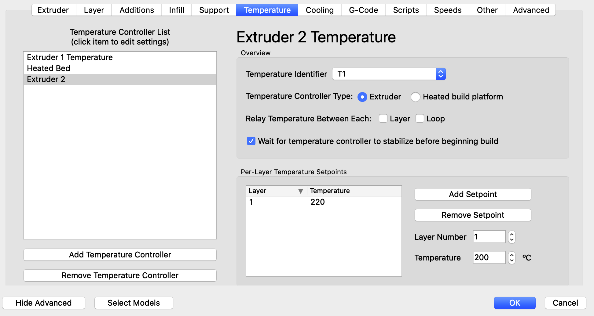 Per—LayerTemperatureSetpoints– Здесь можно выбрать температуру для каждого слоя. Например, при печати ABS пластиком для первого слоя ставим 240 °C, для остальных слоев 220 °C. Таким образом пластик прилипнет очень хорошо и слои лягут ровнее.