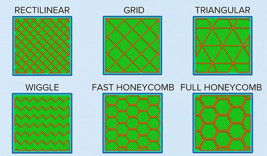 - Internal Fill Pattern – тип (форма) внутреннего заполнения модели, доступны 6 вариантов: «Rectilinear» (линии), «Grid»(сетка), «Triangular» (треугольники), «Wiggle» (волны), «Fast Honeycomb» (быстрое сотовое заполнение), «Full Honeycomb»(полное сотовое заполнение).