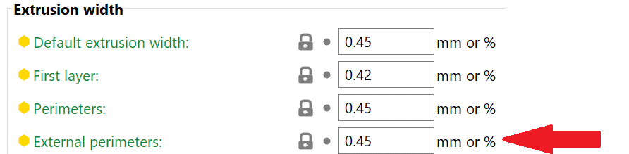 Extrusion width of the external perimeters: The width of the outer perimeter also contributes to the stability of the object. The extrusion width can be set between 100-120% of the nozzle diameter. So with a standard 0.4 mm nozzle, you can print outer walls of 0.4-0.48 mm.However, these values are for normal prints. In vase mode, you can print even thicker walls, because you don’t care about the effects on the left and right side of the extruded filament, because there is nothing there. If you raise the temperature slightly above your standard temperature and print very slowly, you can achieve a thickness of 0.6 mm with a 0.4 mm nozzle.