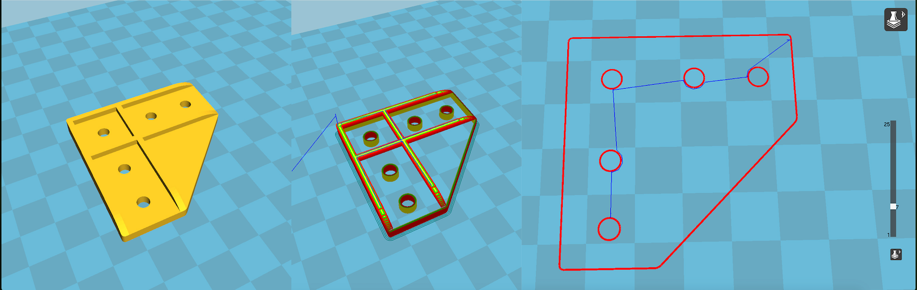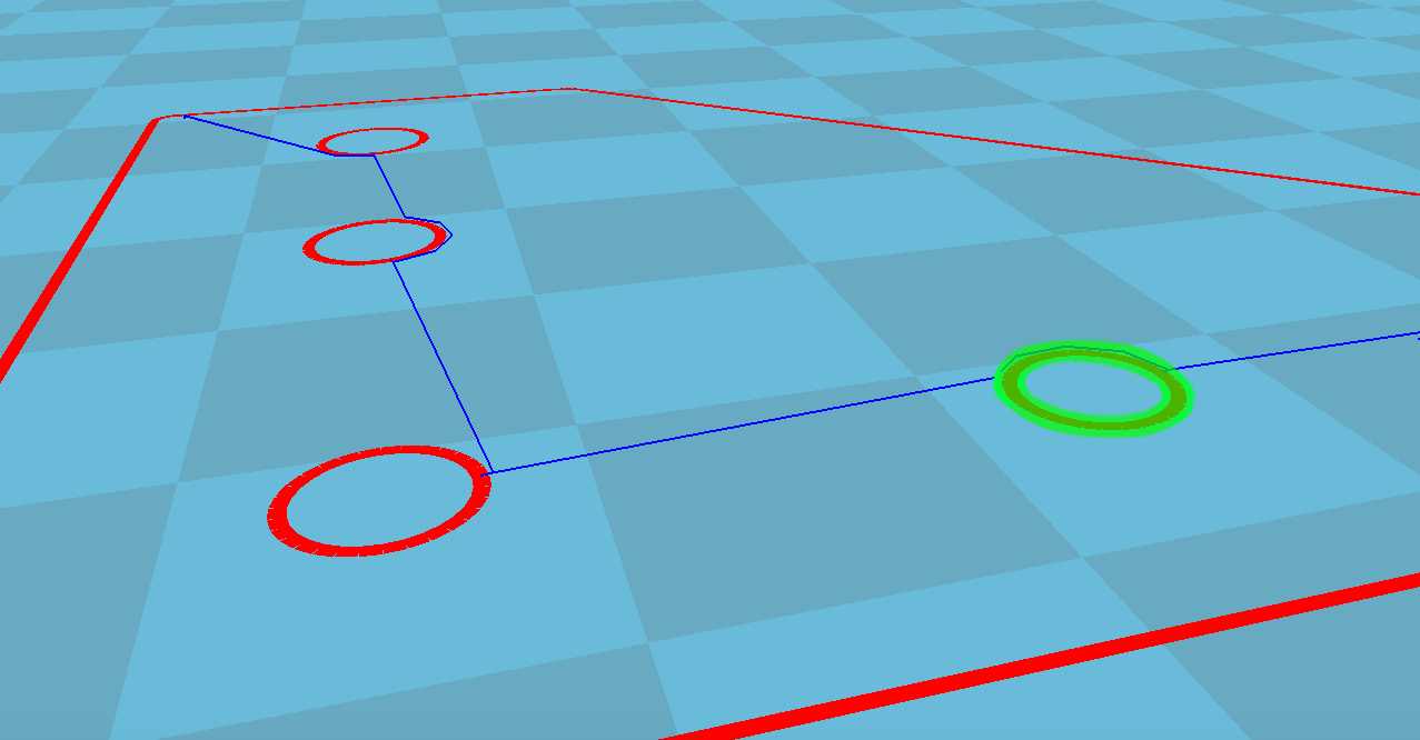 На рисунке показана 3Д-модель, визуализация подготовленного G-кода и траектория движения центра сопла экструдера для 7-го слоя 3Д-печати. Выделим периметры отверстий и на траекторию наложим фактическую ширину эксрузии (Выделена салатовым цветом).