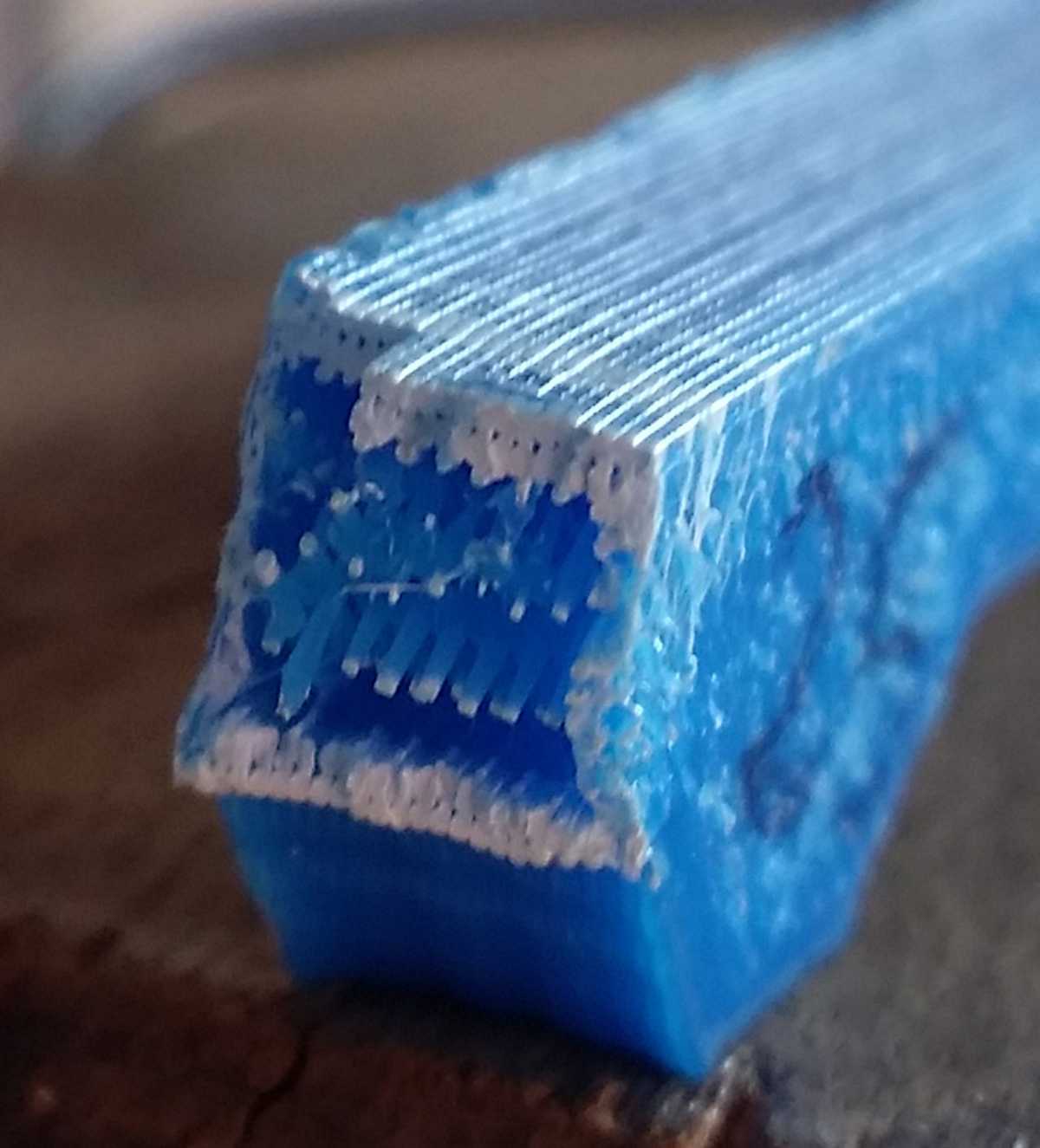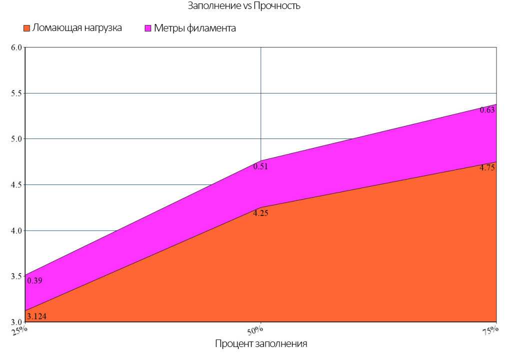 Если посмотреть на график, то у образцов с фиксированной 0,7-миллиметровой стенкой и изменяющимся заполнением наблюдается линейная зависимость между прочностью и использованным филаментом. И это удивительно, поскольку я ожидал, что прочность будет повышаться благодаря утолщению стенок, а не повышению процента заполнения. Почему так вышло – сказать трудно.