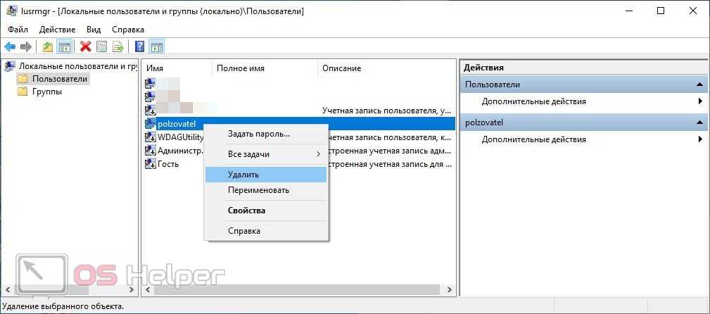 Еще один метод, который требует обращения к приложению «Выполнить». О том, как запустить утилиту, вы узнали из способа выше. Теперь вам нужно ввести команду lusrmrg.msc. В результате откроется окно со списком пользователей и групп. Выделите ветку «Пользователи», чтобы список аккаунтов отобразился в центральной таблице окна. Нажмите на ненужный аккаунт ПКМ и выберите действие «Удалить».