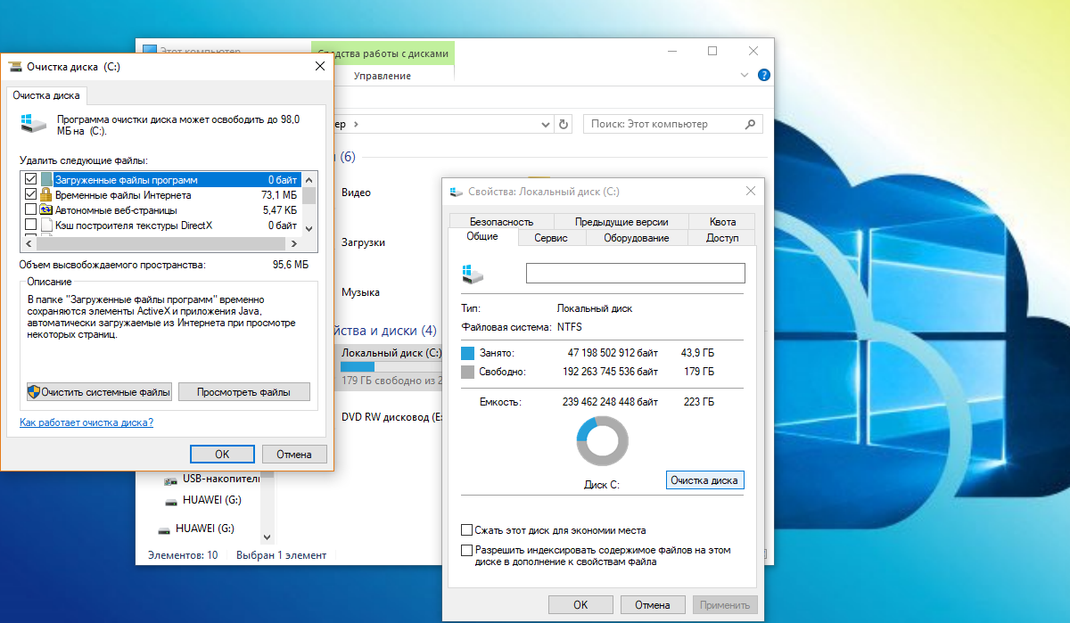 Теперь переходим к тяжёлой артиллерии. В Windows 10 имеется встроенная утилита для очистки диска (точное название которой Disk Cleanup). Она позволяет эффективно очищать дисковое пространство в системе, совмещая в себе все вышеперечисленные возможности.
